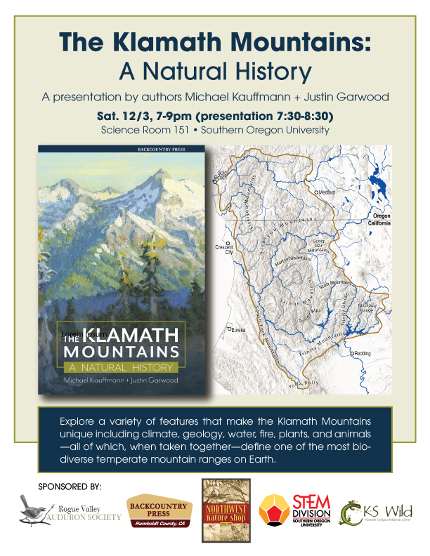 On Saturday December 3rd authors, Michael Kauffmann and Justin Garwood will present this new comprehensive book that celebrates the natural history of the Klamath Mountains of northwest California and southwest Oregon through stories of diversity and resilience over deep time.