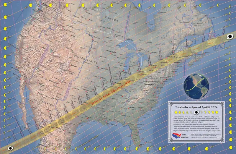 This eclipse will be a warm-up act for the spectacle of the total solar eclipse crossing the United States just 177 days later on Monday, April 8, 2024.  A total solar eclipse happens when the Moon passes between the Sun and Earth, completely blocking the face of the Sun. The sky will darken as if it were dawn or dusk.  The total solar eclipse will cross North America, passing over Mexico, the United States, and Canada. Except during the brief total phase of the eclipse, when the Moon completely blocks the Sun’s bright face, you’ll need solar glasses to safely view this one too!