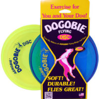 The Aerobie Dogobie flying disc’s flexible but tear and puncture resistant material is gentle on your dog’s mouth and teeth but sturdy enough to endure fetch after fetch. With its patented spoiler rim design, the Dogobie disc is made for long, stable flights even when thrown by a beginner. Size: 8 inch diameter. Available in blue and yellow, the two colors best seen by dogs. (Dogs see other colors as shades of gray.)