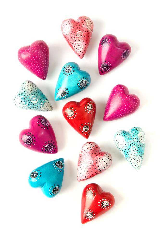 The wildly popular kisii stone hearts have been miniaturized to utilize small scraps of unused stone. Dyed in candy tones and etched with small finishing details, these lovely little handfuls of love will be incredibly popular around Valentine’s, but are appreciated any time of year.