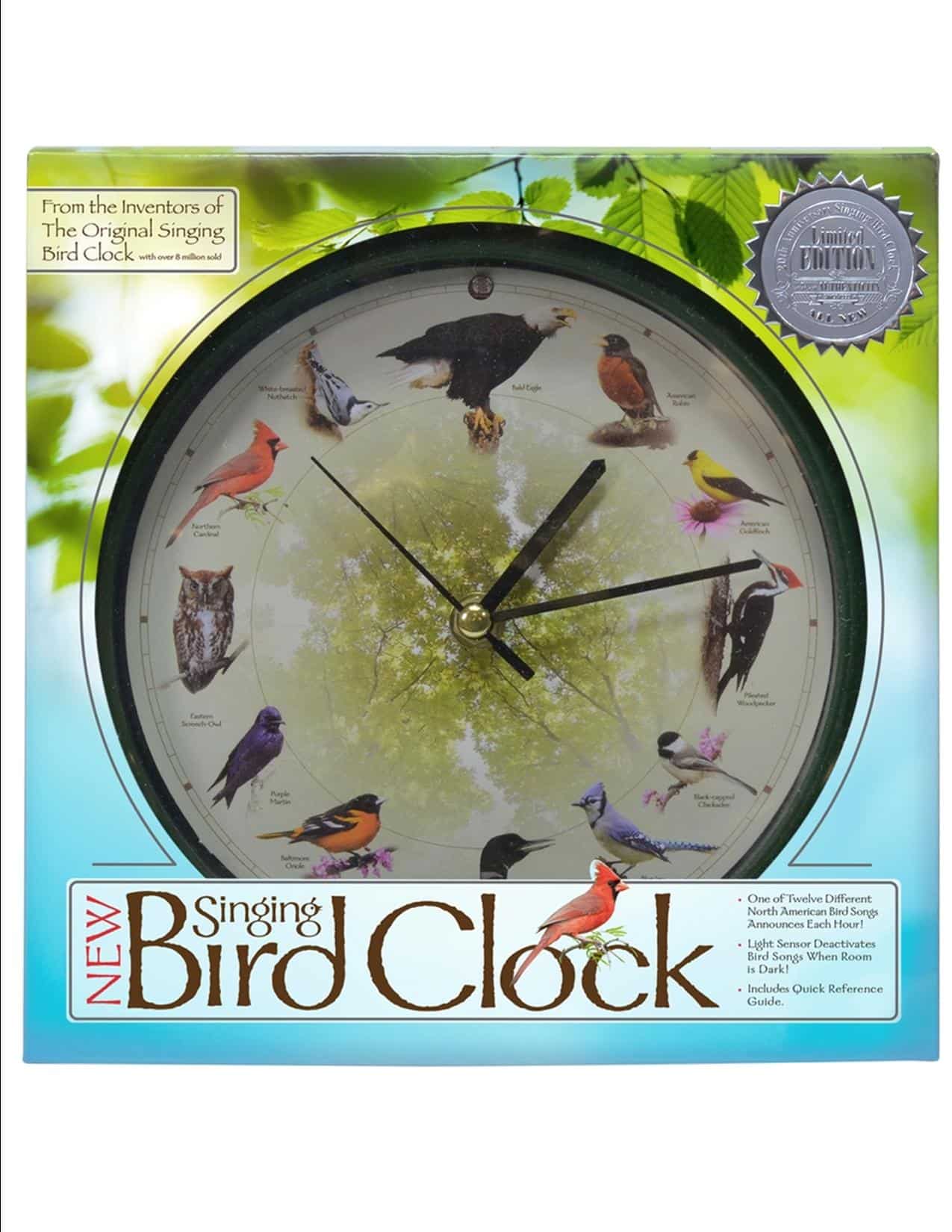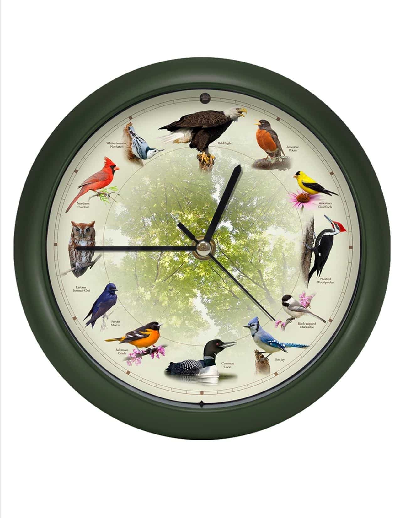 From the makers of the original Singing Bird Clocks This singing bird clock has authentic recordings of 12 favorite and varied North American birds that announce each hour. Manufactured by Mark Feldstein & Associates, these 13″ or 8″ diameter clocks have a light sensor that deactivates the songs when the room is dark. Sound is optional.