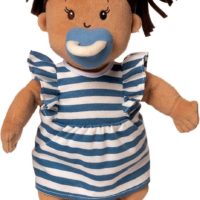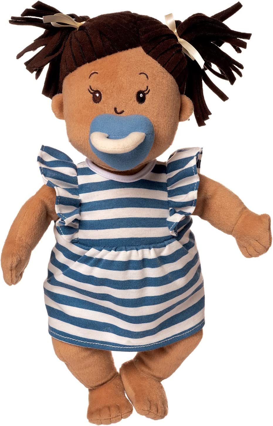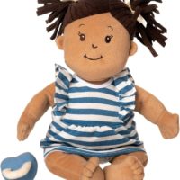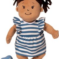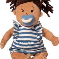 Baby Stella Doll Beige has brown hair pigtails and is dressed in a striped outfit with closures for easy dressing. Baby Stella is an award winning doll collection that is a perfect, first soft doll to inspire creative role play in little ones. Baby Stella dolls have lifelike toes, belly buttons and plump tummies, embroidered features removable outfit, diaper and magnetic pacifier.