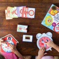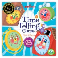This well-designed game will get kids up to speed on telling time. Players move the arms on their own clock faces to show the time described on cards. It is especially good for correlating analog and digital representations of time as well as wording like “half past” and “quarter to.” Cards are color coded for the progression of skills in learning to tell time; each color representing time to the hour, the half hour, the quarter hour, in five-minute intervals, or for all sixty minutes. Points are awarded for setting clocks to the correct time, as well as for correcting clocks to the specified time, making playing a reinforcement of time telling skills.