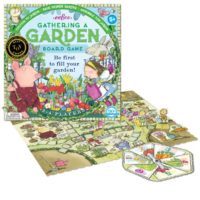 While playing Gathering A Garden Board Game you collect items to place in your garden from the shopkeepers such as fruit trees, vegetables, herbs, flowers, and birds and be the first to get home.