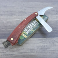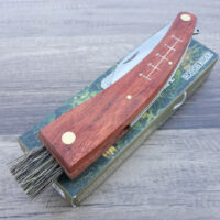 This knife sports a scythe-like blade common to mushroom knives. The jimping on the spine of the blade is used to knock dirt off the mushroom. There is a swivel mounted boar’s hair bistle brush so the bristles can stay protected when not in use and a stainless steel graduated rule. There are also rule marks on the handle. Comes boxed.