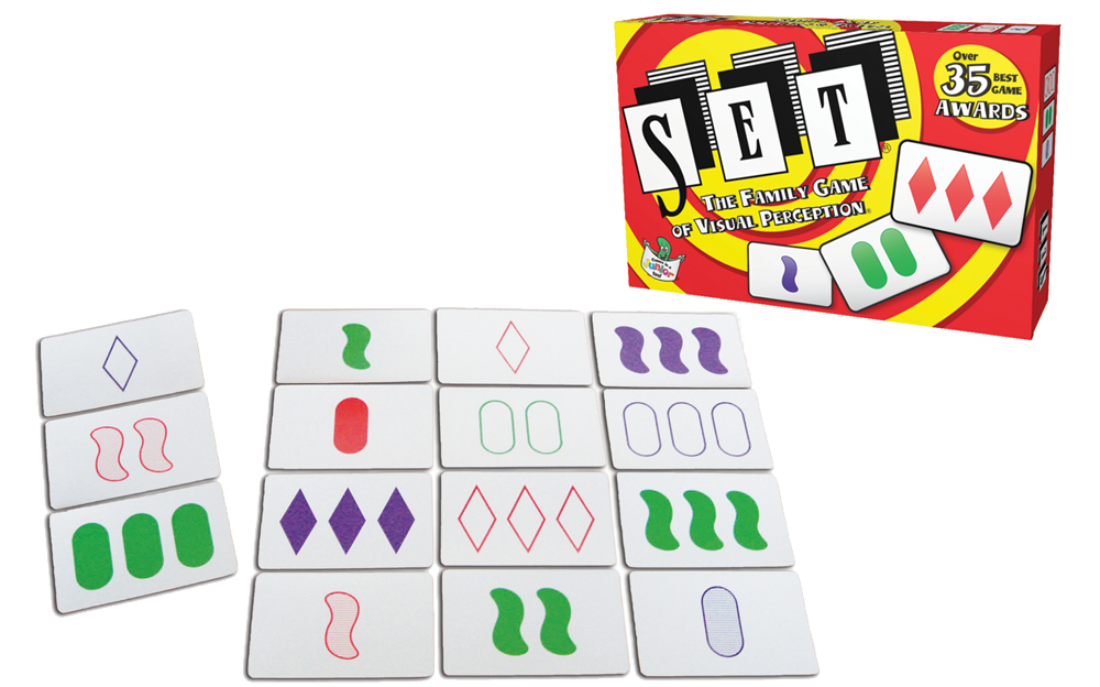 Set Card Game is a board game where any table becomes the board. It is a highly addictive, original game of visual perception. The goal is to be the first to see a SET from the 12 cards laid face up on the table. A SET is three cards that are either all the same or all different in each individual feature. With no turns and no luck, the Set Card Game is challenging, fast and fun!