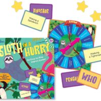 Quick! Can you act Who, What, & How? Take turns drawing a Who and What card, then spin for the How! Are you a Zombie Roller Skating on the Moon? Or perhaps a Penguin Walking a Tightrope with a Robot Partner? This quick-action improv game gets kids up, active, and laughing. Easy to learn and play, Sloth in a Hurry is a non-competitive, confidence building game. Illustrated by Monika Forsberg.