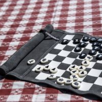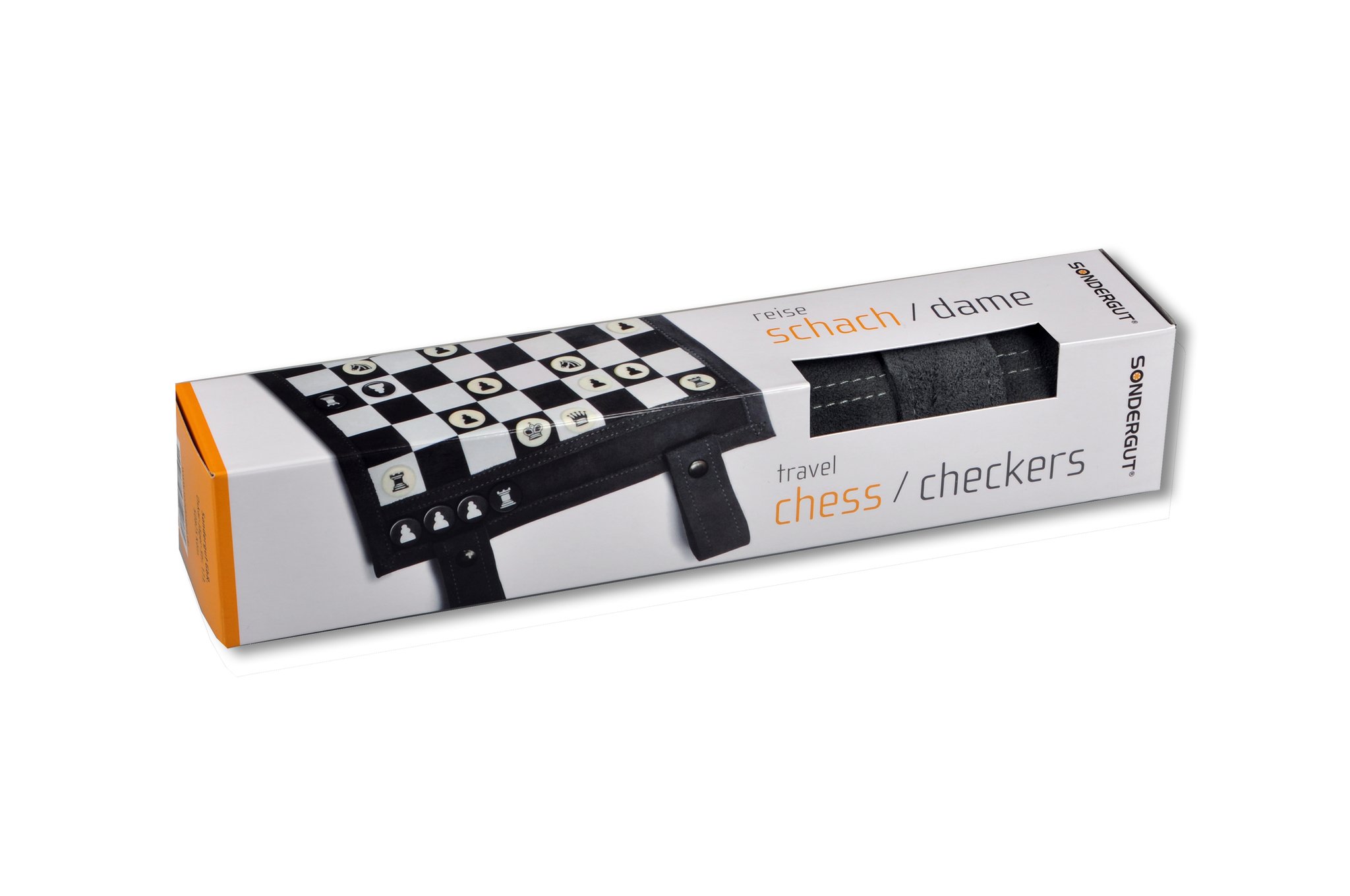 The Sondergut leather travel chess and checkers game rolls up to the size of a pocket umbrella (10 x 2”). Great for travel or the home! You can play chess almost anywhere — and with style.