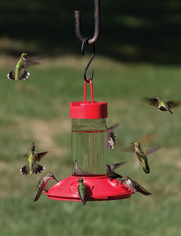 This well designed feeder is incredibly sturdy and will withstand years of use. The red base attracts hummingbirds and moats around feeding ports help repel insects. It is dishwasher safe, with a wide-mouth for easy cleaning and filling. It doesn’t leak in windy weather and is bee resistant!