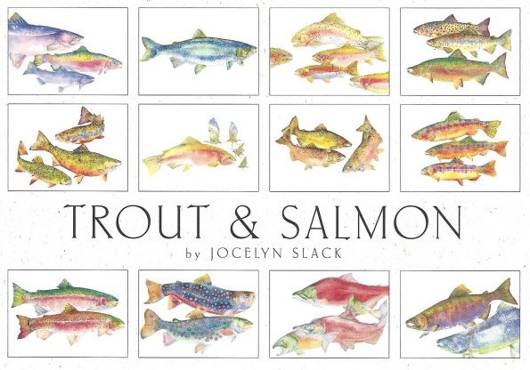 This set of note cards skillfully depicting trout and salmon is hand crafted by artist Jocelyn Slack. Each card shows a different fish or group of fish and has a blank interior allowing you to personalize for any occasion. Packaged in an attractive green box, this note card set makes a great gift in itself. Printed on 100% post-consumer waste recycled paper by Crane Creek Graphics.
