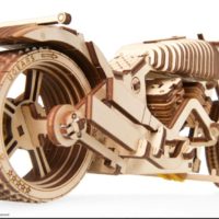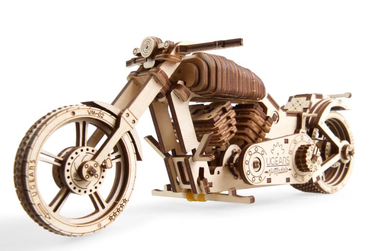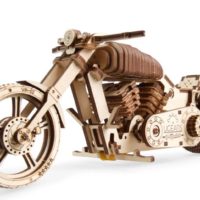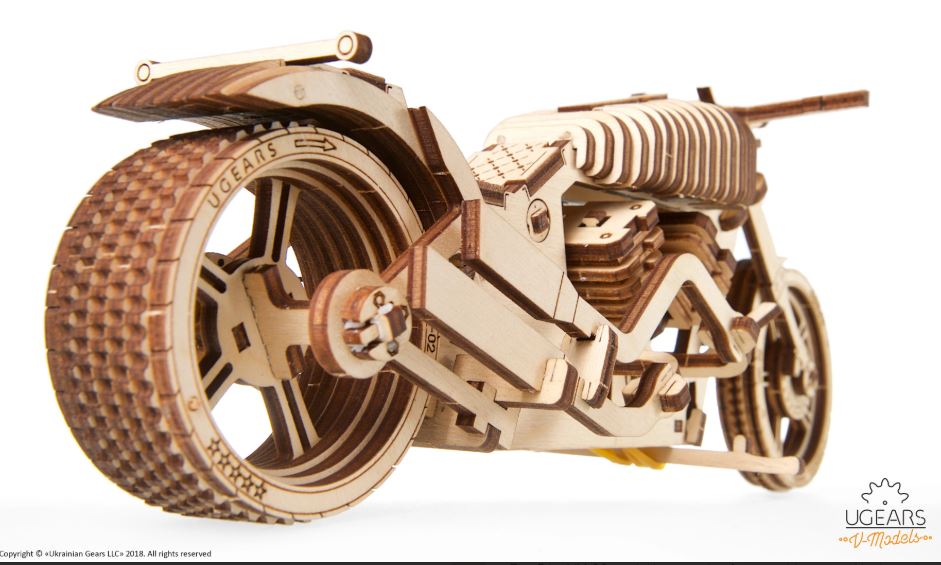The open road is calling! Feel the freedom and exhilaration of the ride with the bold UGears Bike VM-02. The beautifully accurate model is powered by a rubber band motor that allows it to travel up to 10 feet in one winding. Observe the mechanics, including moving pistons, that make this bike go, and use the working steering wheel to control the motorcycle route. Flip down the front kick-stand to safely park your bike on your desk or bookshelf. Each kit comes with precisely laser-cut pieces and step-by-step instructions for easy assembly. This model takes about 3-4 hours to assemble and measures 10.1 x 3.3 x 4.1 inches when completed. Recommended for ages 14 and up.