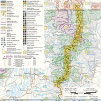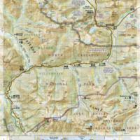 The Washington South Topographic Map Guide follows the Pacific Crest Trail (PCT) as it travels through a landscape dotted with lakes, perennial snowfields, and small glaciers. In the heavily eroded, rugged mountains of central Washington, the PCT crosses steep ridges and high mountain passes. The trail skirts the base of Mount Adams and its volcanic fields covered in large lava flows and avalanche debris. As the PCT approaches the Oregon border it dramatically drops into the Columbia River Gorge and passes over the Columbia River on the Bridge of the Gods.