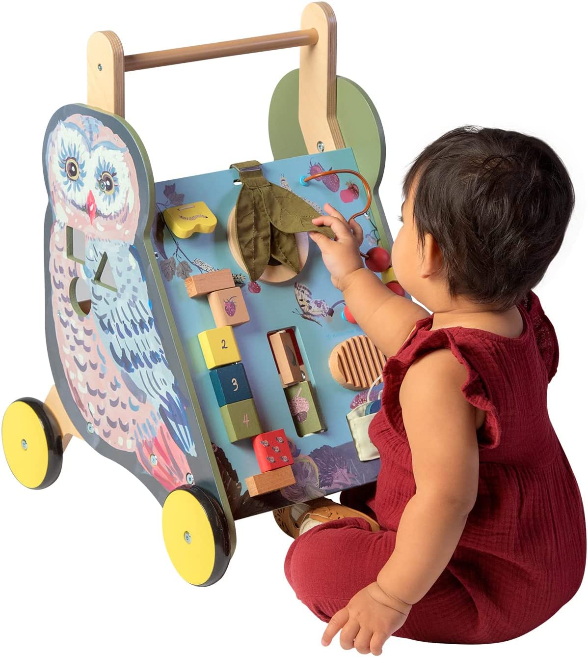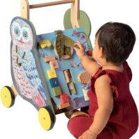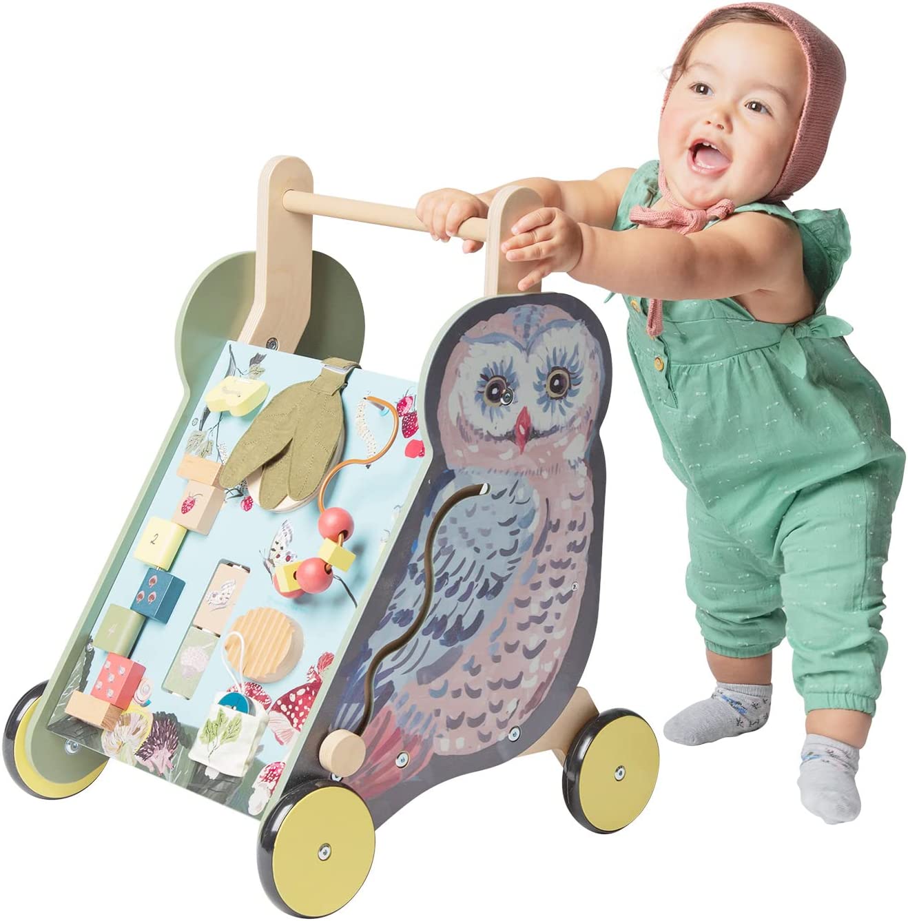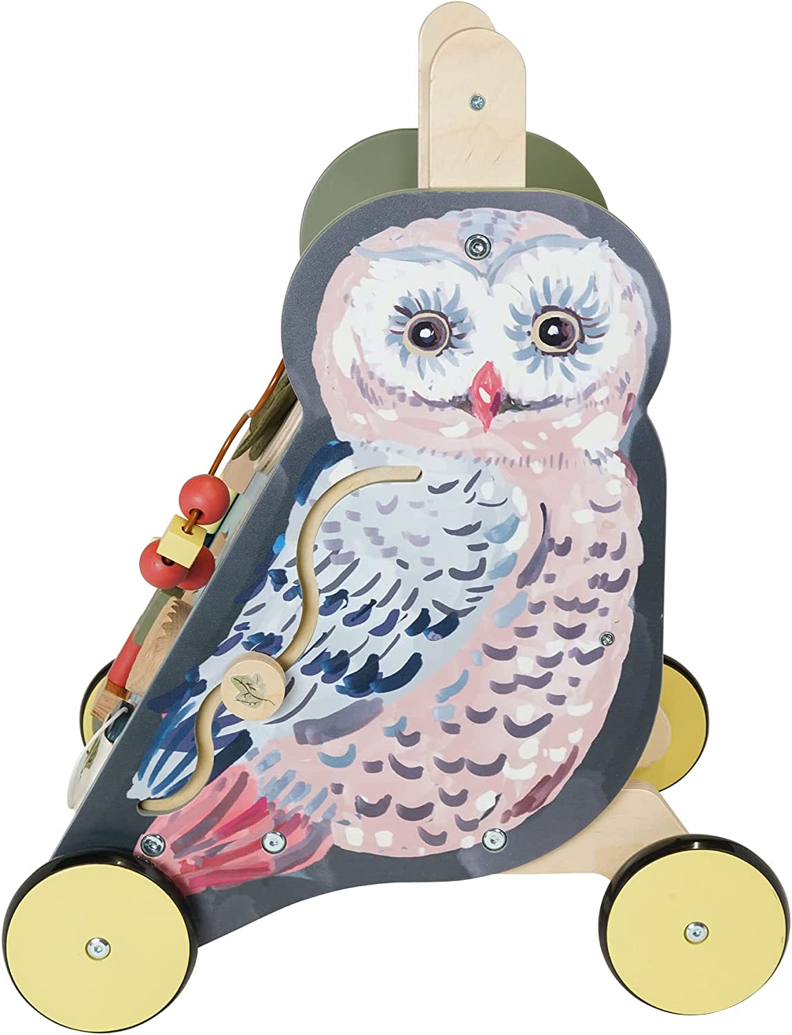 This owl-themed wood push cart offers three ways to play – seated, standing, or on the move. Encourage motor development and cause-and-effect learning with every play session. This pushcart is packed full of activities and fidgets like a shape sorter with fabric bin to catch shapes, a bead run, glider, clackers, spinners, washboard and pick with storage pouch and a peek-a-boo mirror with fabric leaves. Wood wheels feature plastic rims that roll across most flat surfaces. Adult assembly required.